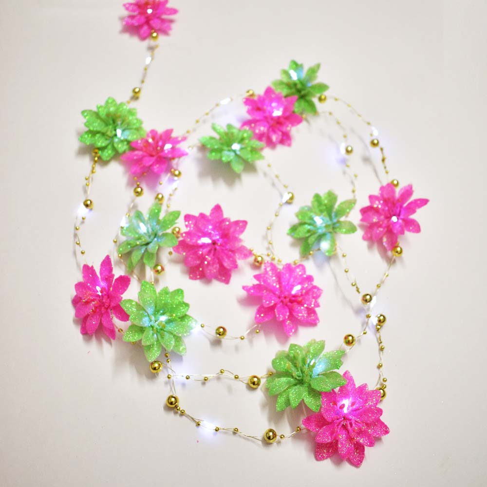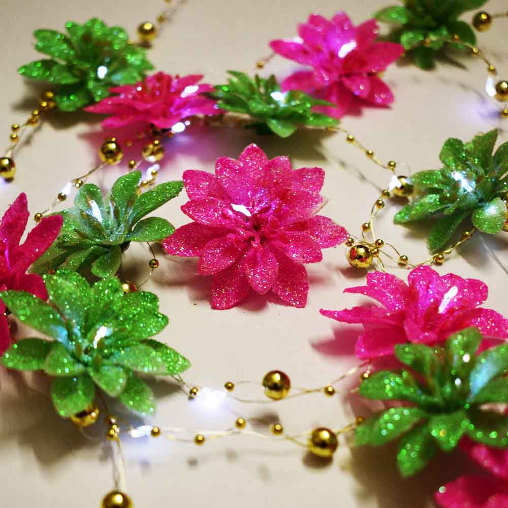 Decorate your beautiful home with our 31 LED String lights with 15 sparkling pink & green flowers embellished with golden pearl string.Best for Diwali decor, Christmas, Birthdays, Weeding Decoration.